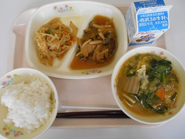 今日の給食は、ごはん、牛乳、和風ハンバーグ、切り干し大根の炒り煮、ぶたキムチスープ です。