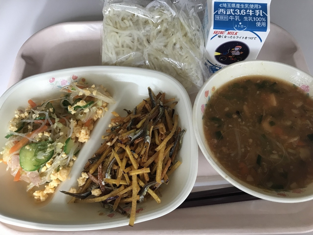 今日の給食は、マーボーラーメン、牛乳、小魚入り松葉いも、中華サラダ です。