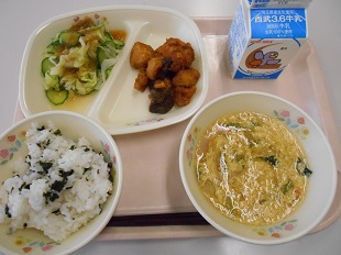今日の給食は、わかめごはん、牛乳、鶏肉とレバーのオレンジソース、キャベツときゅうりのドレッシング、かきたま汁です。