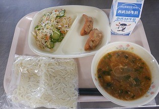きょうの献立は、麻婆ラーメン・揚げぎょうざ・ねぎ
