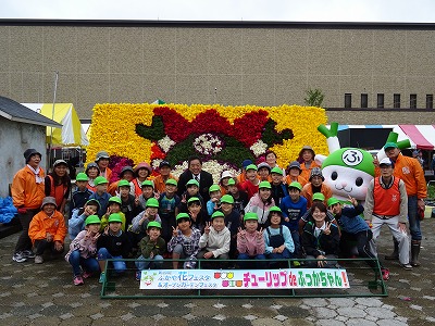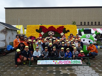 4月27日(土)・28日(日)に開催されます『第16回ふかや花フェスタ&オープンガーデンフェスタ』にあわせて、今日、本校4年生が約1万4000本のチューリップの花で、市のイメージキャラクター「ふっかちゃん」の巨大な花絵を作成しました。