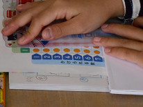 さらに、6の段の時に交換法則も勉強してあるので、7×2=2×7、7×3=3×7、7×4=4×7、・・・とできます。また、6の段のときも、6×5=4×5+2×5 と分ける方法を学んでいるので、7の段でも 7×5=3×5+4×5 というように分けて求めることもできます。