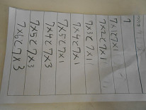 昨日の授業では、7の段をつくっていく際、7×5=7×2+7×3 というように、かける数を分割していく方法でやっている子もいました。6の段の時は、かけられる数を分割していたのですが、7×5の前に学習した7×2と7×3を足せばいいという考えでした。このような柔軟な考えのできる子をどんどん育てていきたいと思います。