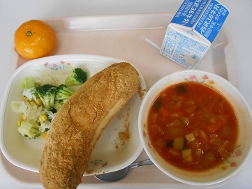 今日の給食は、白ごまきなこ揚げパン、牛乳、イタリアンサラダ、夏野菜のミネストローネ、冷凍みかん です。