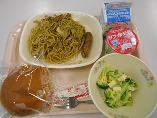 今日の給食は、こどもパンスライス、牛乳、焼きそば、焼きウインナー、チーズサラダ、ヨーグルトです。