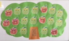 保健室廊下に、むし歯治療の様子を表した掲示物があります。1学期は、1年1組、2年3組、5年2組が全員治療が済みました。