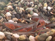 まだ、ほとんどの赤ちゃんは、大きな栄養の袋をつけていて重くて動けません。多くのサケが自由に動くのには、もう少し時間がかかりそうです。