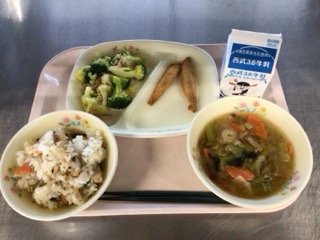 きょうの献立は、かてめし・きびなごフライ・花野菜の