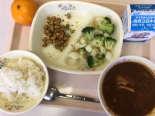 今日の給食は、ハヤシライス、牛乳、大豆のカリカリ揚げ、花野菜サラダ、冷凍ミカン です。