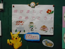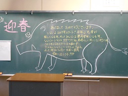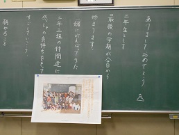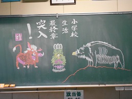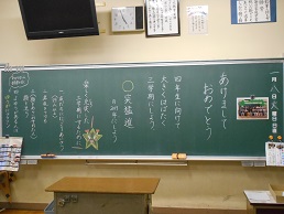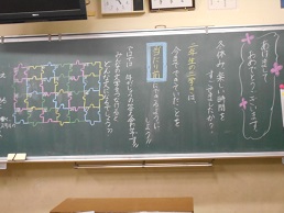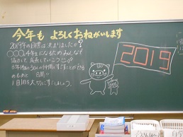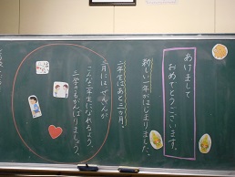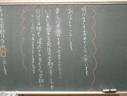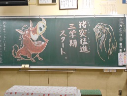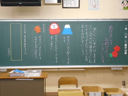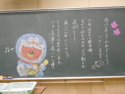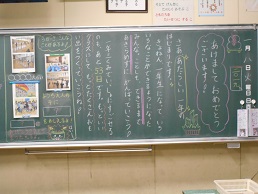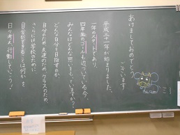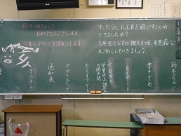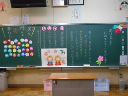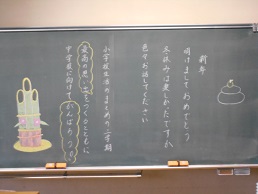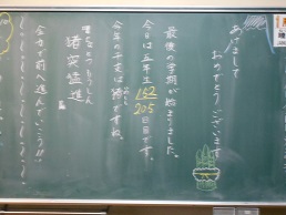 3学期スタートの朝、子供たちが教室に入ってすぐ目にする黒板。本校では、子供たち向けに、それぞれの担任が工夫して「思い」を込めて書きました。