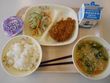 今日の給食は、かつ丼、牛乳、はるさめサラダ、かき玉汁、ぶどうゼリー です。