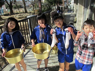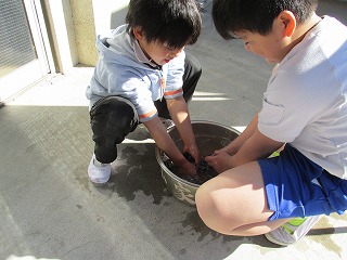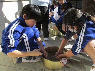 社会で「古い道具と昔のくらし」を勉強しています。今日は昔と今の洗濯の違いを学びました。残念ながら洗濯板はありませんでしたが、おけに水をくんで手洗いで自分の靴下を洗いました。子どもたちからは「冷たい!」「昔の人は大変だったんだな~。」といった声が聞こえてきました。