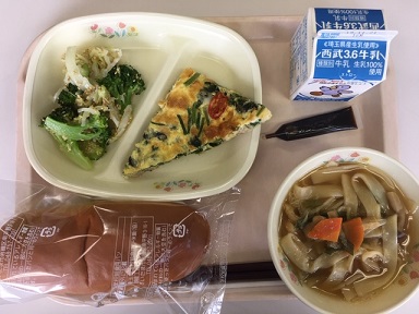 今日の給食は、黒パン、牛乳とコーヒー味ミルメーク、煮ぼうとう、ステンドグラスキッシュ風、ふっかちゃんのゴマゴマサラダ です。