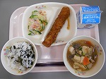 今日の給食は、わかめごはん・牛乳・ホルモン揚げ・上州サラダ こしね汁です。