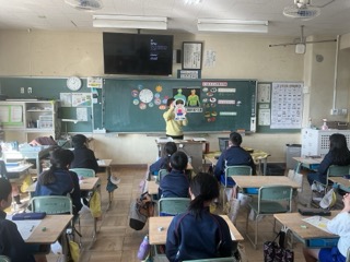 先日、4年生に向けて栄養教諭の先生が朝食の大切さについて授業を行いました。