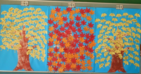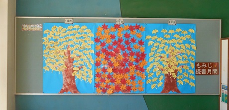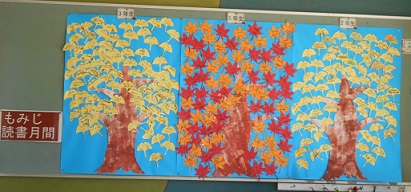 東西の昇降口に『もみじ読書月間』の掲示があります。それぞれの学年ごとに「もみじ」と「いちょう」の葉を貼っています。