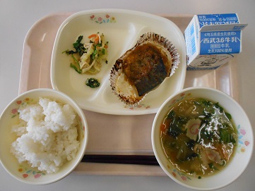 今日の3学期初めての給食は、ごはん、牛乳、サバのネギ味噌焼き、切り干し大根のサラダ、白玉雑煮です。
