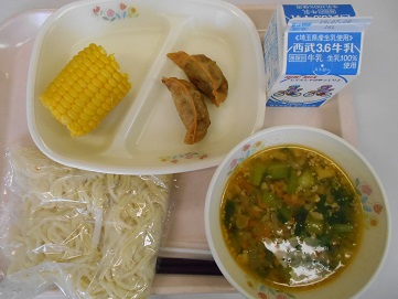今日の給食は、タンタン麺、牛乳、揚げ餃子、ゆでトウモロコシ です。