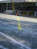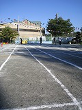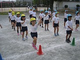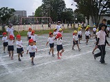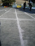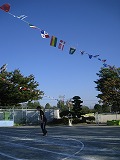 子供たちが帰った後、先生たちは、用具を揃え、万国旗を飾り、園庭にはいろいろなラインを引きました。