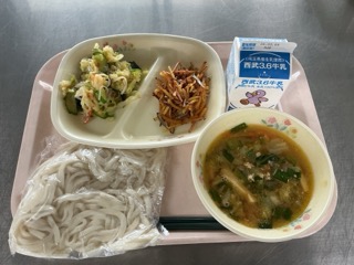 きょうの献立は、白ごまタンタンうどん・松葉芋・和風