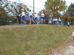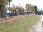 子供たちは、さっそく、持久走練習で新しく生まれ変わった斜走路を快走しています。