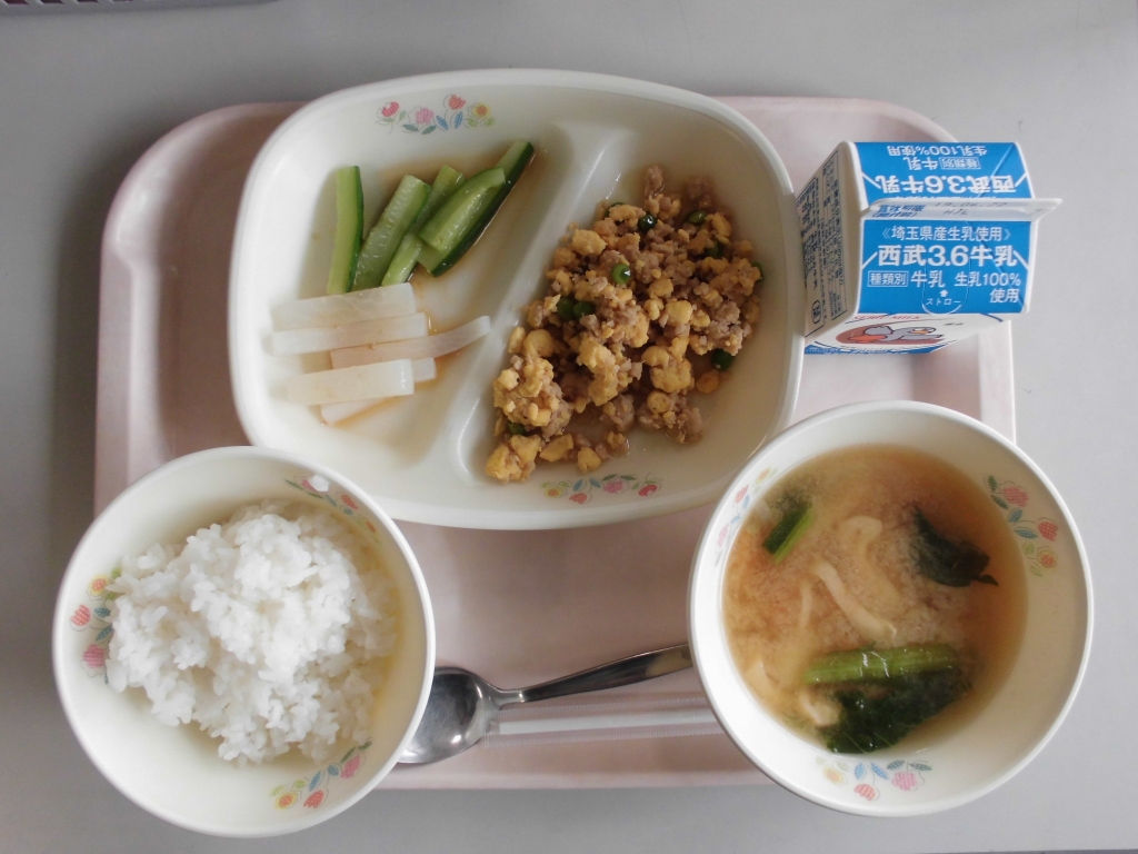 今日の給食は、 3色そぼろごはん、牛乳、ジャガイモの味噌汁、スティック野菜 です。
