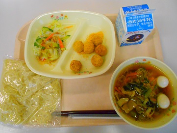 今日の給食は、醤油ラーメン、牛乳、十五夜団子、はるさめサラダ です。