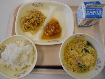 今日の給食は、 ごはん、牛乳、、鶏肉のバーベキューソース、切り干し大根の炒り煮、かきたま汁 です。