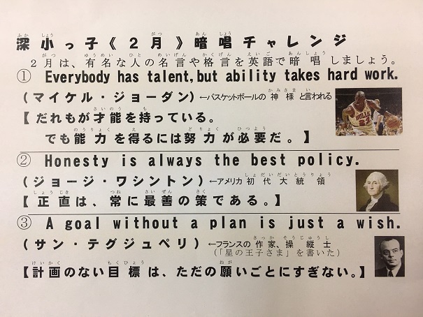 2月の暗唱課題は、英語であり、とっても難しくなっています。そんな中、本日、休み時間に1年生が校長室に「暗唱をしてもいいですか?」と言ってきたのです。「どうぞ」と言うと、何と、すらすらととっても良い発音で全然間違えずに言えたのです。何と素晴らしいのでしょう。一発合格です。びっくりしました。