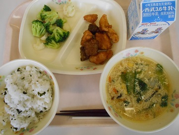 今日の給食は、わかめご飯、牛乳、鶏肉とレバーのオレンジソース、花野菜サラダ、コーン入り華風スープ です。