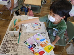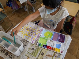 水の量を変えるだけで、ちがった色に見えたり、にじませることで雰囲気が変わったり、一人一人がくふうして描いていました。