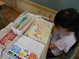 今日は図工「絵の具ハーモニー」を行いました。筆の使い方や水の量をくふうして、いろいろな線や点を描きました。