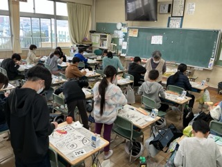 本日、4年生で 絵手紙教室を行いました。6月の社会科見学で、東秩父和紙の里で漉いた和紙に、持ってきた画材を絵の具で描いたり、家族の方への日頃の感謝を墨を使って書いたりしました。
