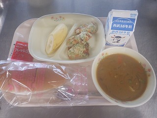 ごはん・ホルモン揚げ・上州サラダ・こしね汁・牛乳です。