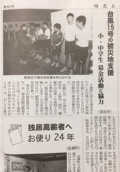 今回台風19号で大きな被害を受けてしまいましたが、先日、台風15号で被害を受けた方々への募金活動が深谷駅であり、本校からも1人参加してくれました。そのときの記事が埼北よみうりに掲載されました。