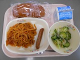 今日の給食は、黒パン、j牛乳、ナポリタンスパゲティ、焼きフランク、チーズサラダです。