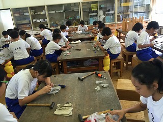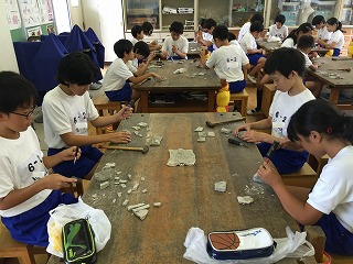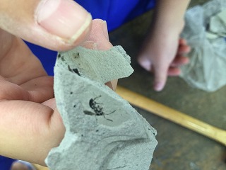 実際に石を割って、化石をさがしました。