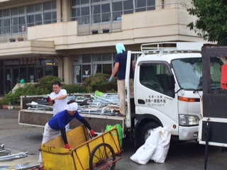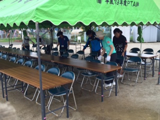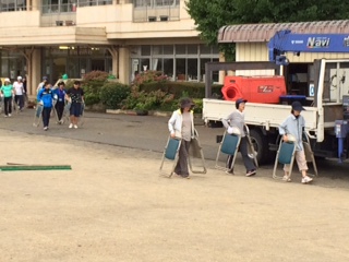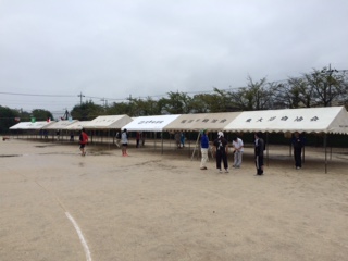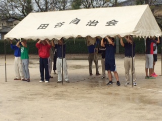 各自治会や中学校からお借りしたテント18張りを組み立てたり、校内の整備をしたりしていただきました。