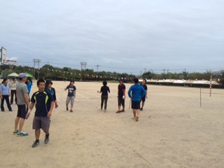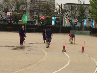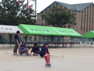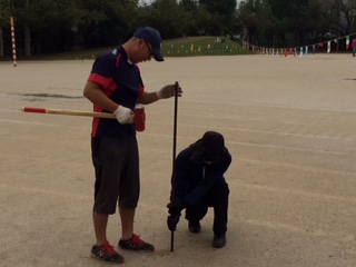PTAの皆さんが帰られた後、ラインを引き杭を打ち、机やいすを並べるために