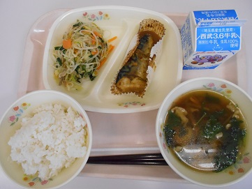 今日の給食は、ごはん、牛乳、サバのねぎみそ焼き、野菜炒め、沢煮椀 です。