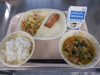 今日の献立は、ごはん・春巻き・生揚げのチャオサイ・