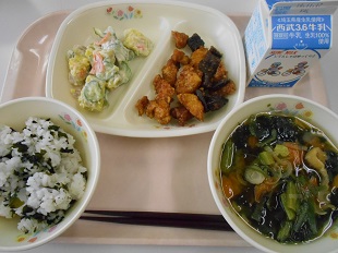 今日の給食は、わかめごはん、牛乳、鶏肉とレバーのごまだれ、サツマイモサラダ、豆腐の味噌汁 です。