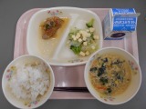 今日の給食は、ごはん、牛乳、韓国風鶏の照り焼き、チーズサラダ、コーン入り華風スープです。