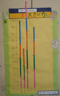 これまでの成果を記録しているグラフが、ボランティア委員会の子供たちの頑張りと、ご家庭の協力を示しています。ありがとうございます。これからも、よろしくお願いいたします。