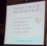 時には笑いを誘い、時にはせつせつと訴える講師の先生のお話を、子供たちも保護者の方々も、私たち教職員も、引き込まれるようにうかがいました。私たちが生まれながらにもっている「命の力」を大切にするために、「ホッとする時を大切にする」「心配な時は相談する」「自分の気持ちを伝える」「嫌な時、嫌なことは伝える」「怖いと思ったら逃げる」というお話には、なるほどと納得しました。また、赤ちゃんがお母さんのおなかの中から出て初めて呼吸したことの証である産声(うぶごえ)が体育館に響いた時の、子供たちの真剣でいてどこか嬉しそうな表情がとても印象に残っています。