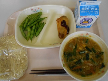 今日の給食は、胡麻味噌ラーメン、牛乳、アメリカンドッグ、枝豆 です。