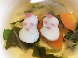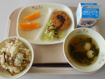 今日の給食は、かてめし、牛乳、コロッケと茹でキャベツ、すまし汁、紅マドンナ です。