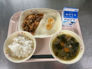 骨丸ごとおかかあえ・かき玉汁・牛乳です。