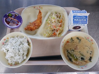 わかめごはん・鶏肉のから揚げ・春雨サラダ・かきたま汁・