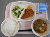 今日の給食は、カツどん、牛乳、なめこ汁、はなやさいサラダです。